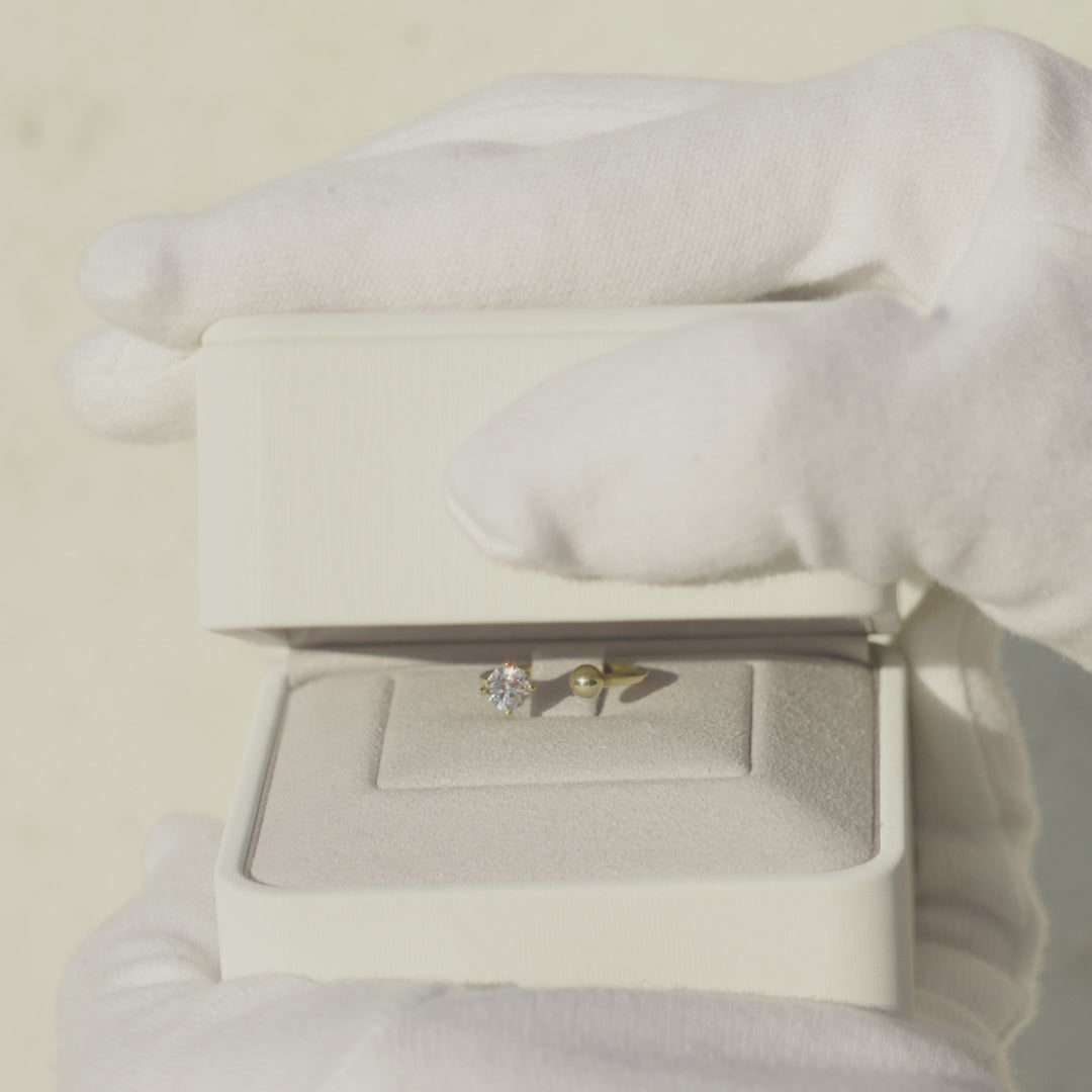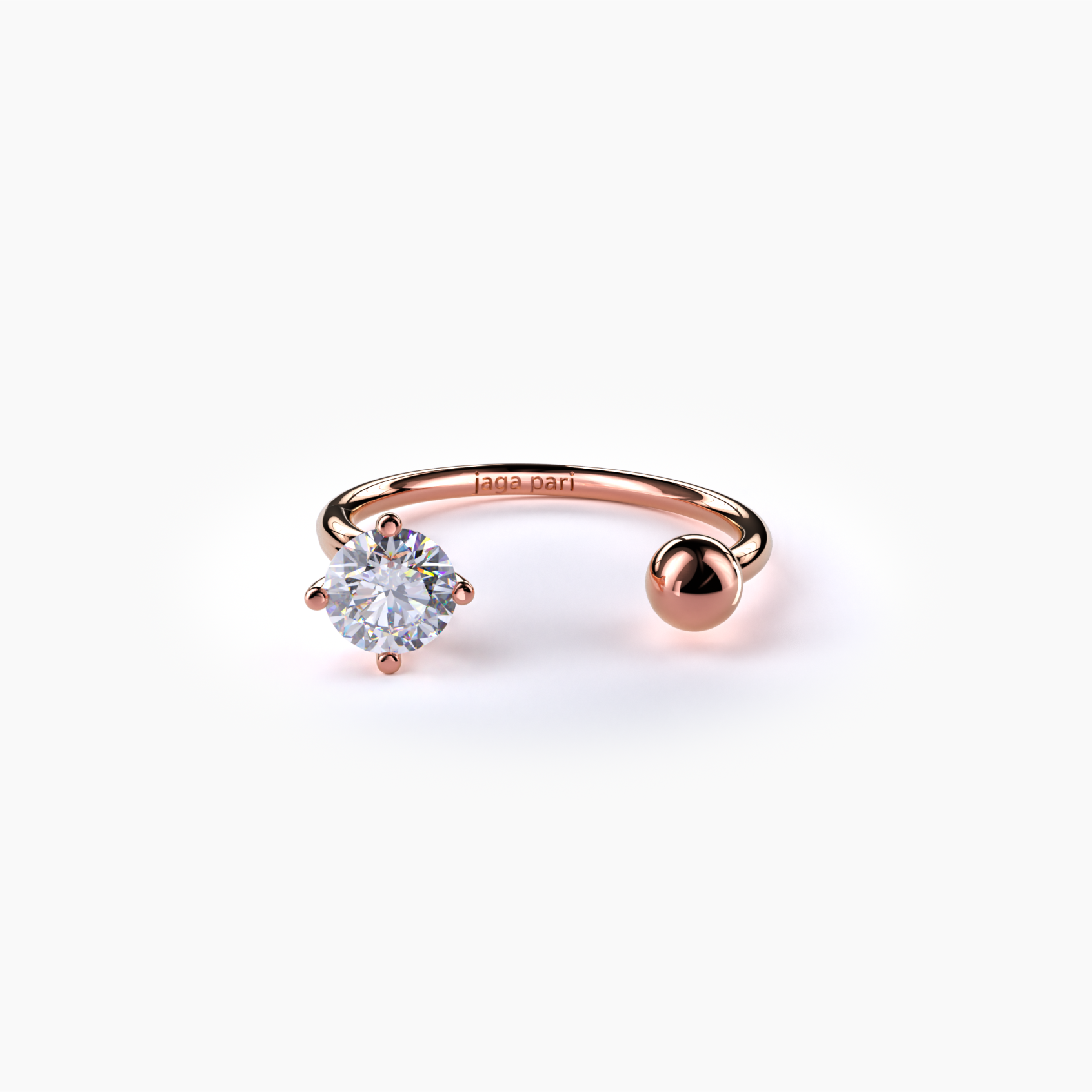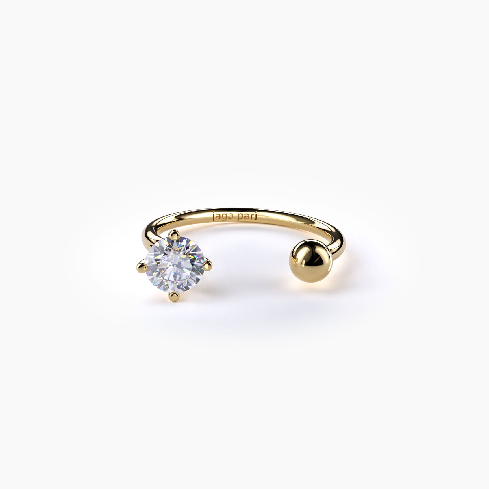 A bold reimagining of the traditional engagement ring, featuring a brilliant  0.5 round diamond balanced by a perfect sphere on an open band. This architectural design in 18K gold creates a striking contrast between the sparkling diamond and the polished metallic orb, symbolising the perfect balance of two souls united.