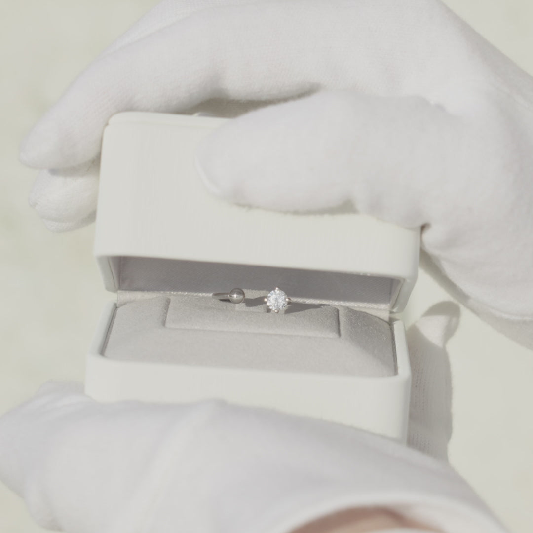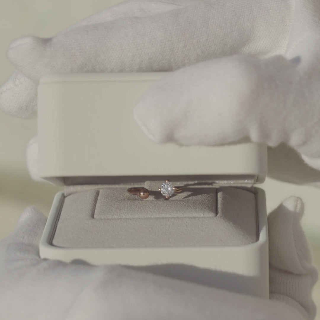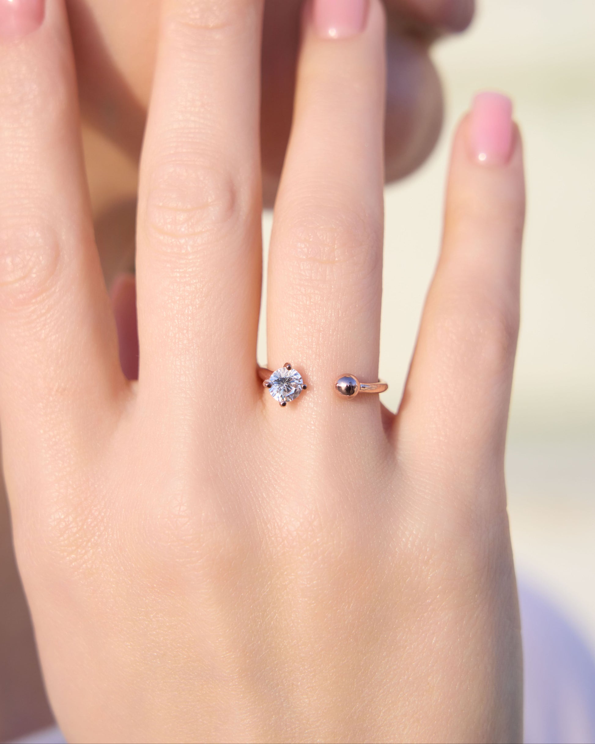 A bold reimagining of the traditional engagement ring, featuring a brilliant  0.5 round diamond balanced by a perfect sphere on an open band. This architectural design in 18K gold creates a striking contrast between the sparkling diamond and the polished metallic orb, symbolising the perfect balance of two souls united.
