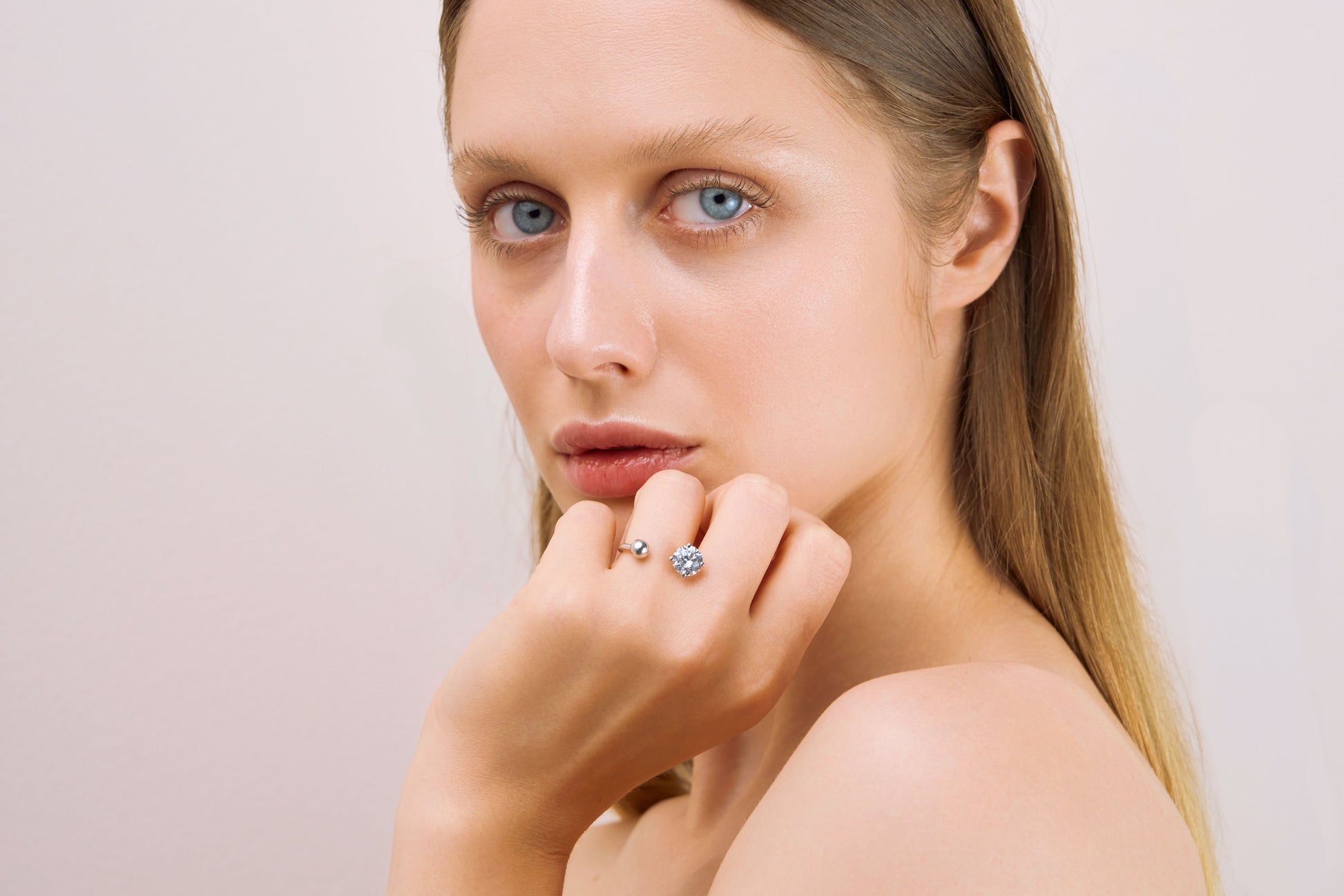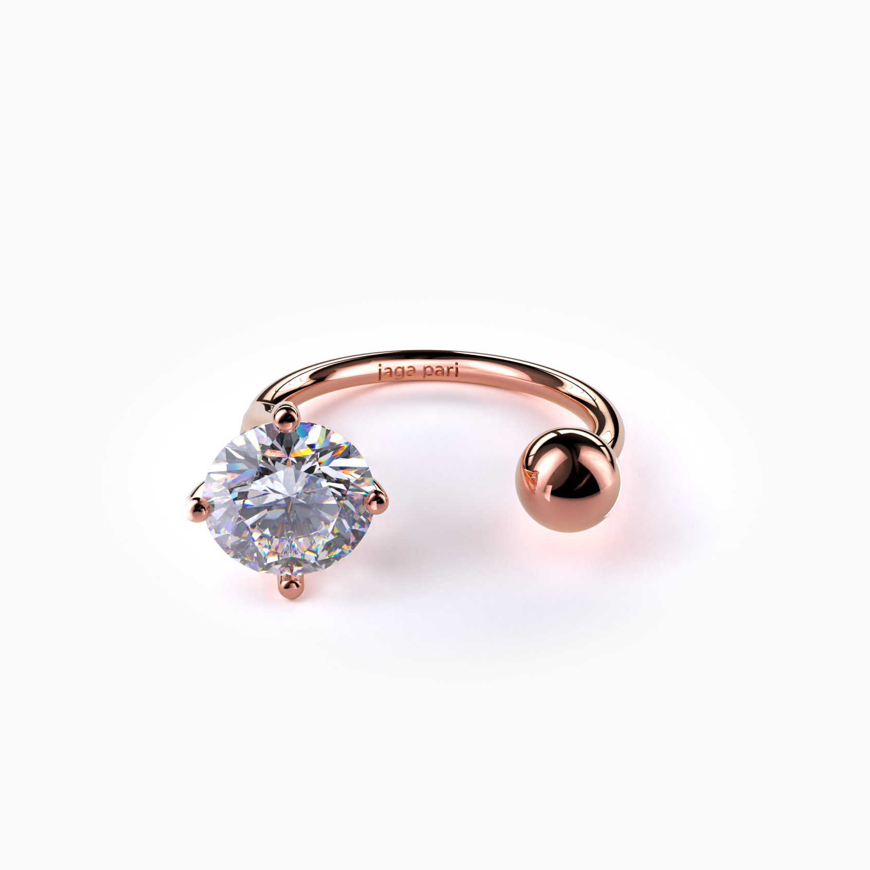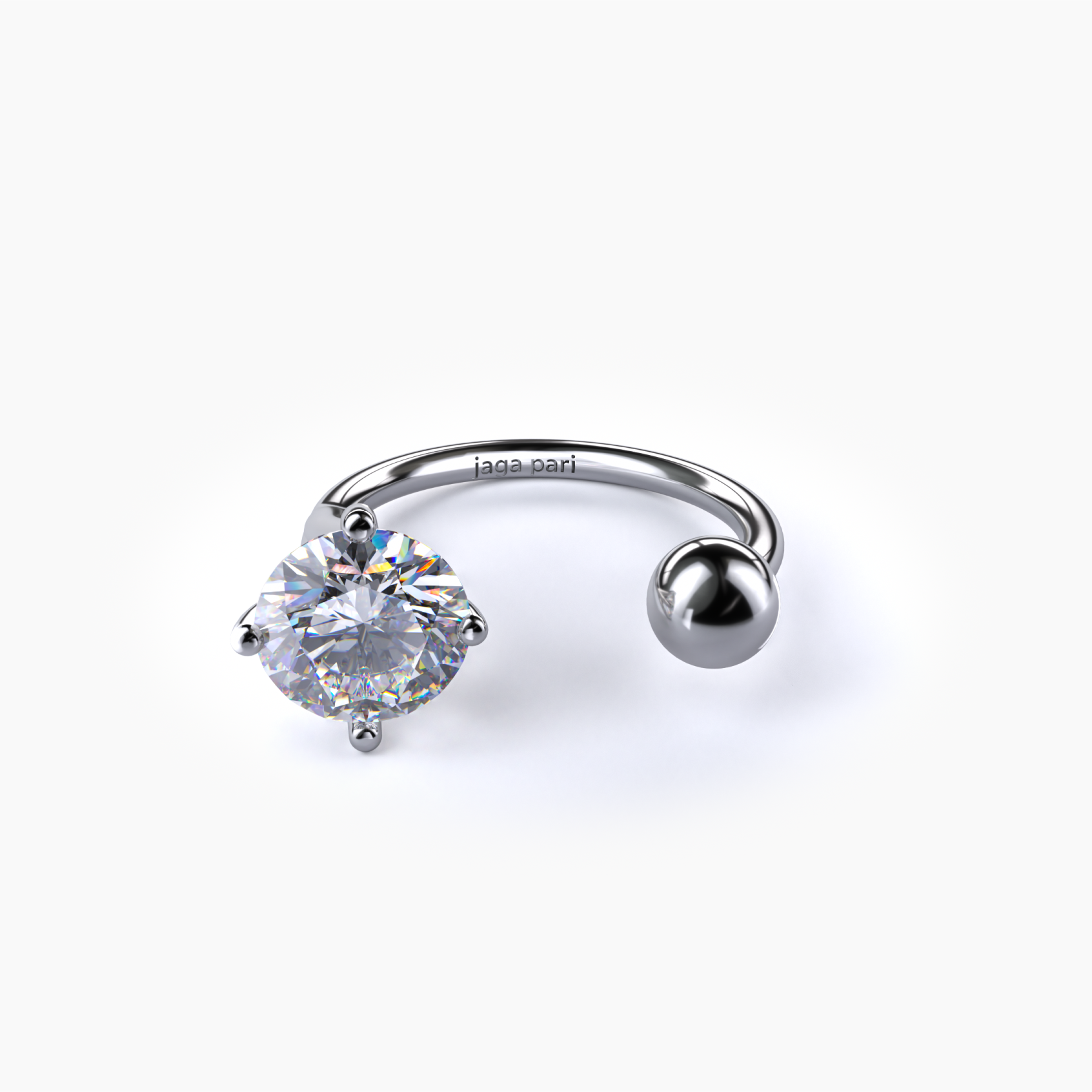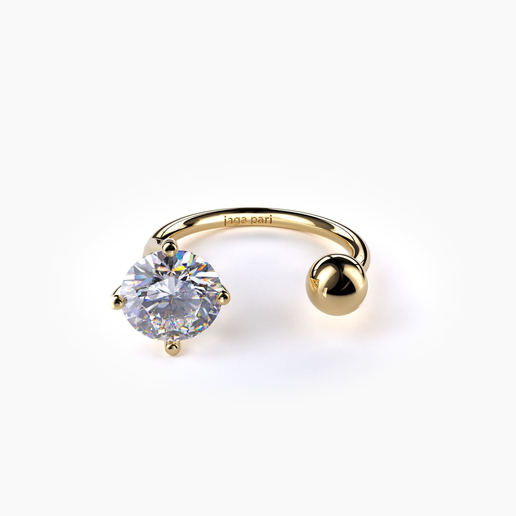 A bold reimagining of the traditional engagement ring, featuring a brilliant 2 carat round diamond balanced by a perfect sphere on an open band. This architectural design in 18K gold creates a striking contrast between the sparkling diamond and the polished metallic orb, symbolising the perfect balance of two souls united.