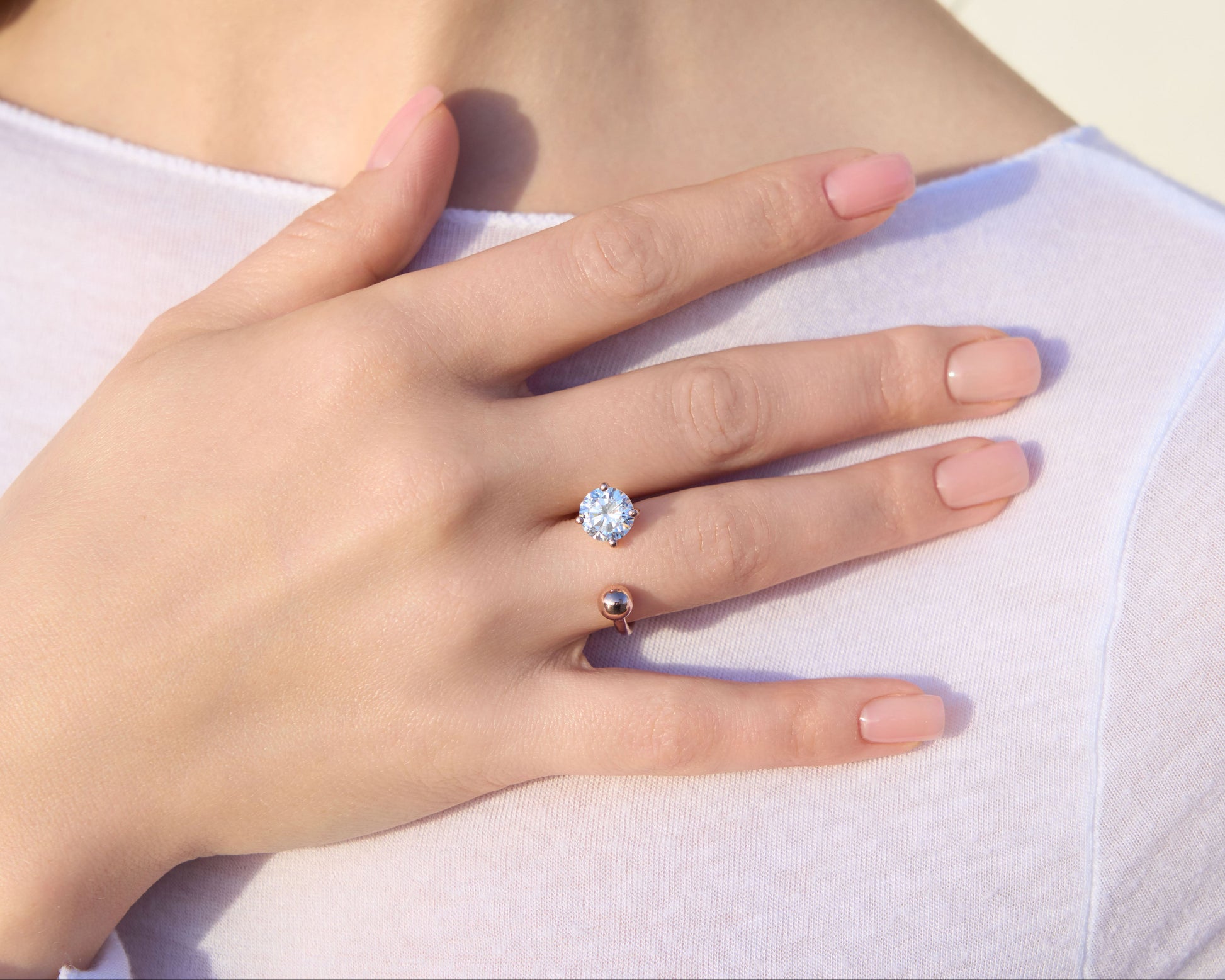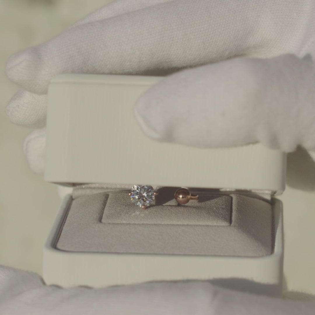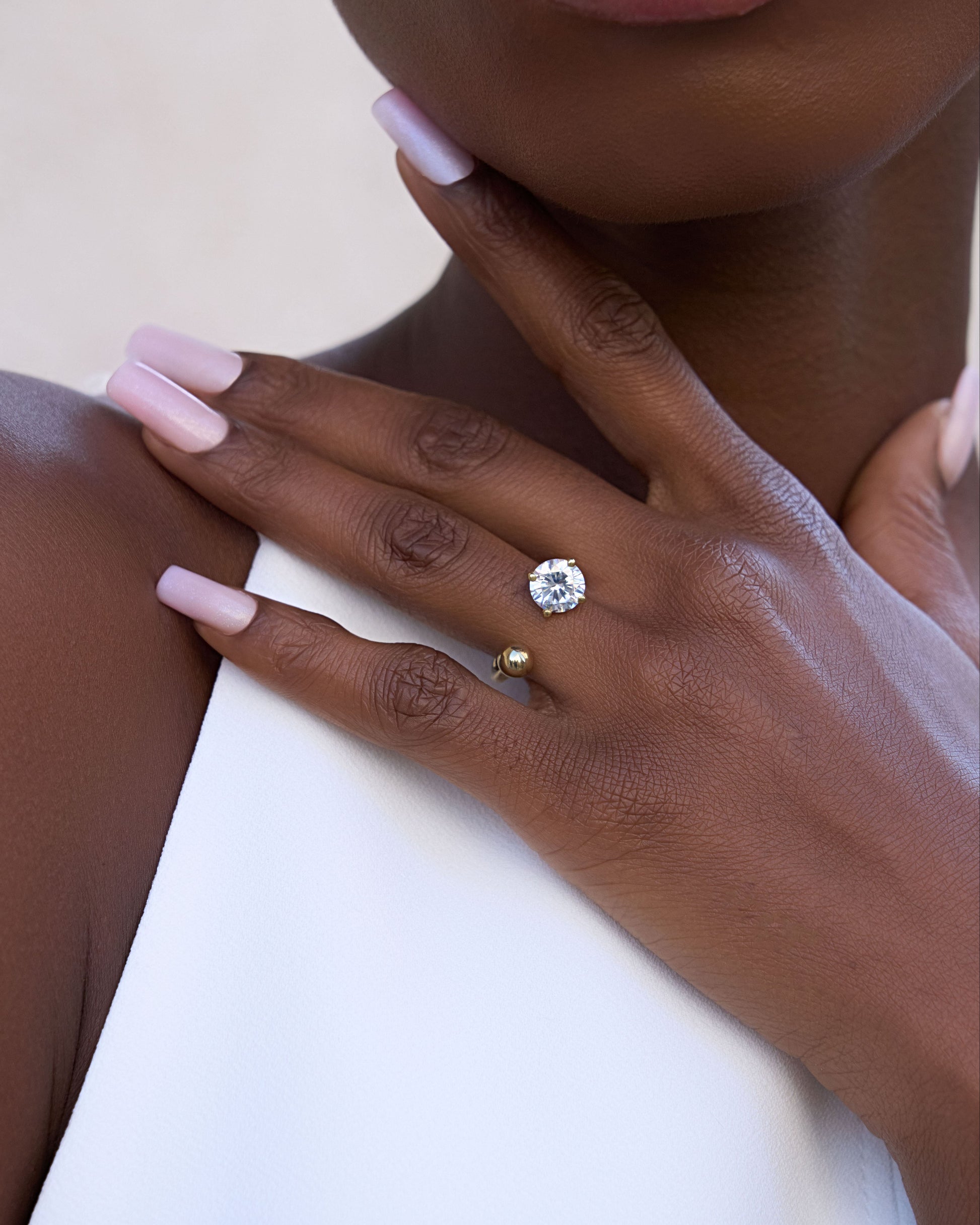 A bold reimagining of the traditional engagement ring, featuring a brilliant 2 carat round diamond balanced by a perfect sphere on an open band. This architectural design in 18K gold creates a striking contrast between the sparkling diamond and the polished metallic orb, symbolising the perfect balance of two souls united.