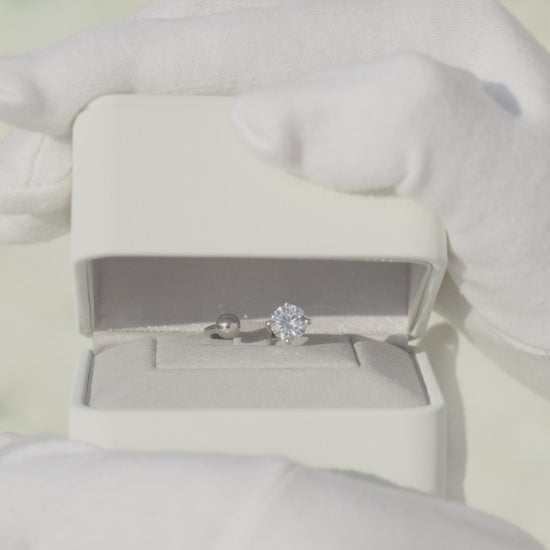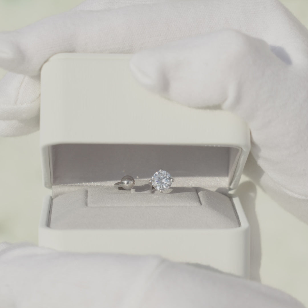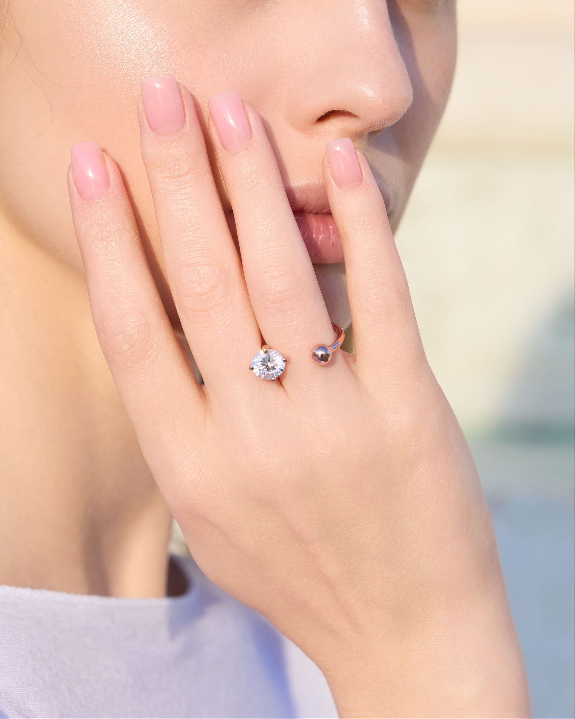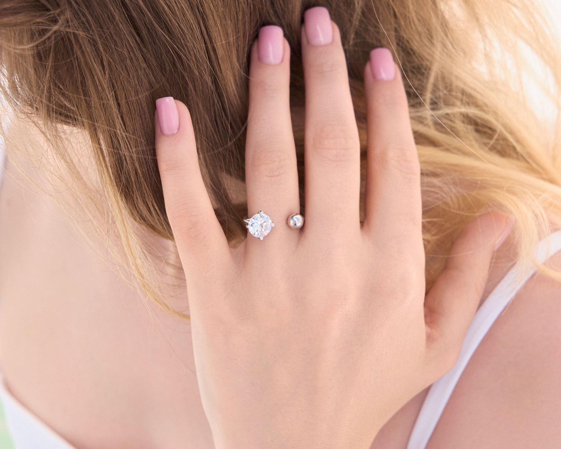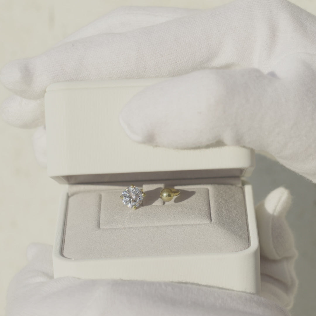 A bold reimagining of the traditional engagement ring, featuring a brilliant 2 carat round diamond balanced by a perfect sphere on an open band. This architectural design in 18K gold creates a striking contrast between the sparkling diamond and the polished metallic orb, symbolising the perfect balance of two souls united.