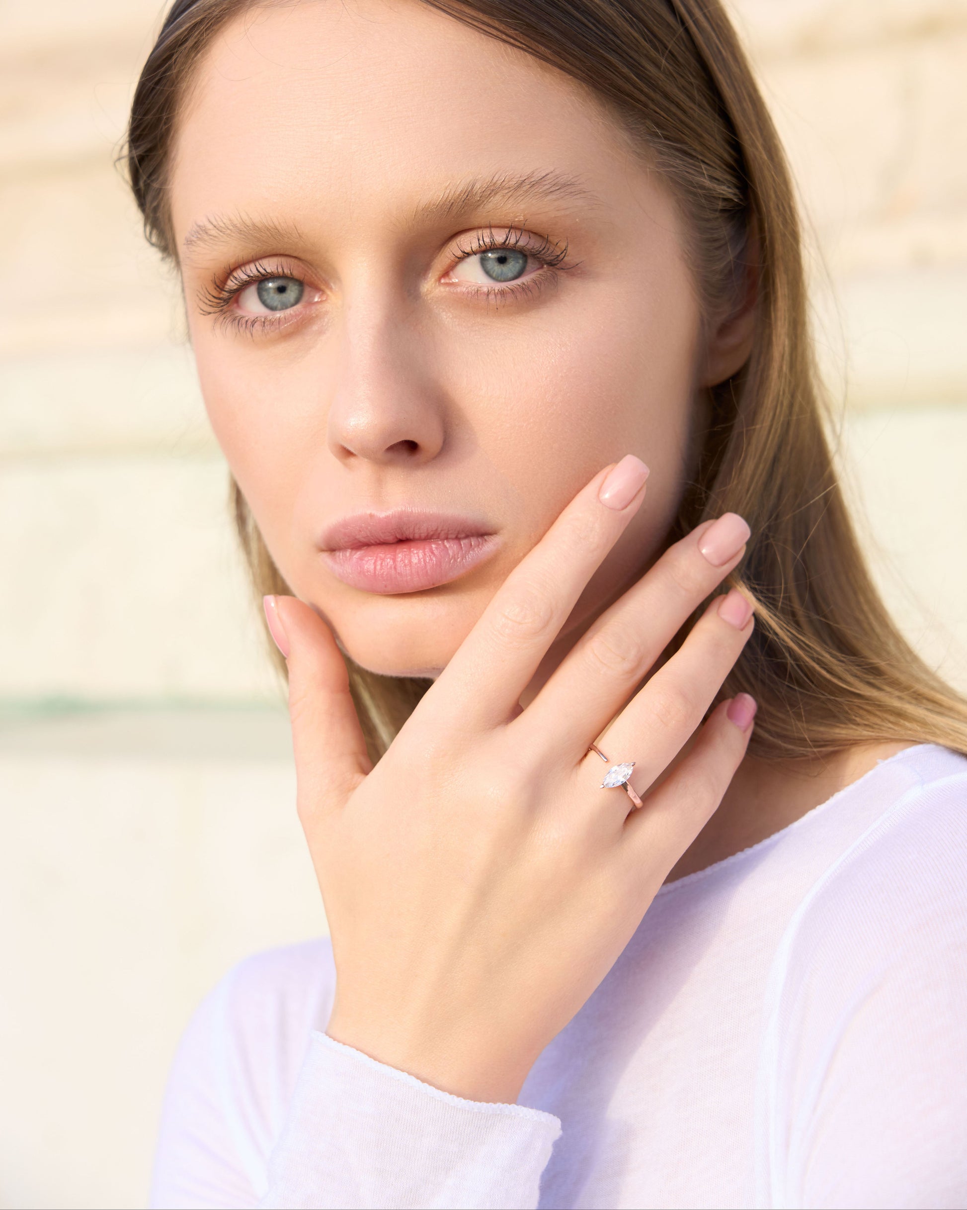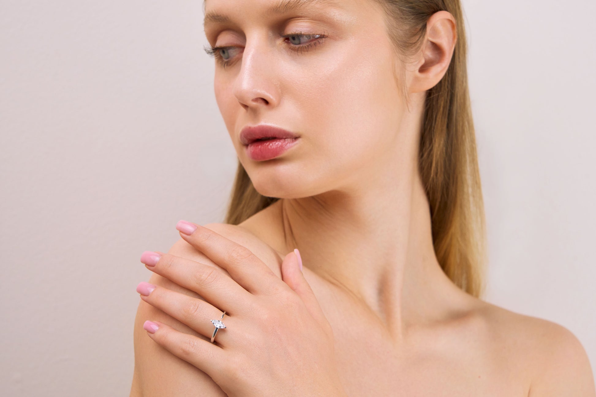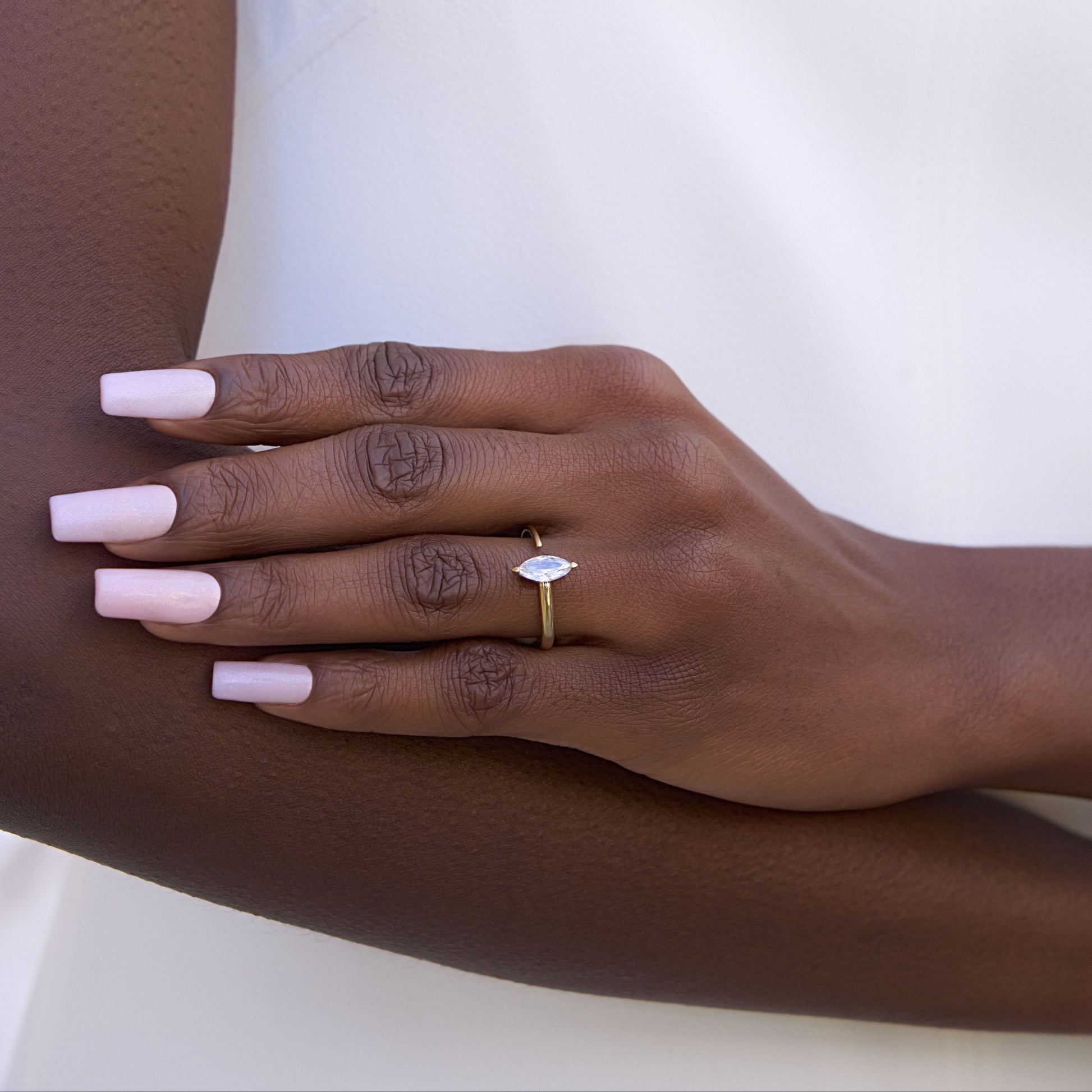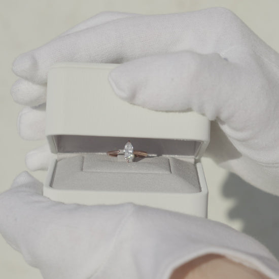An innovative interpretation of the classic marquise cut, where the 0.5 carat diamond seems to float within a flowing band of 18K gold. The open design creates a mesmerising play of light, while the clean lines maintain our signature minimalist aesthetic.