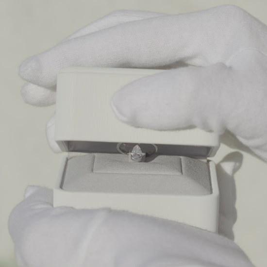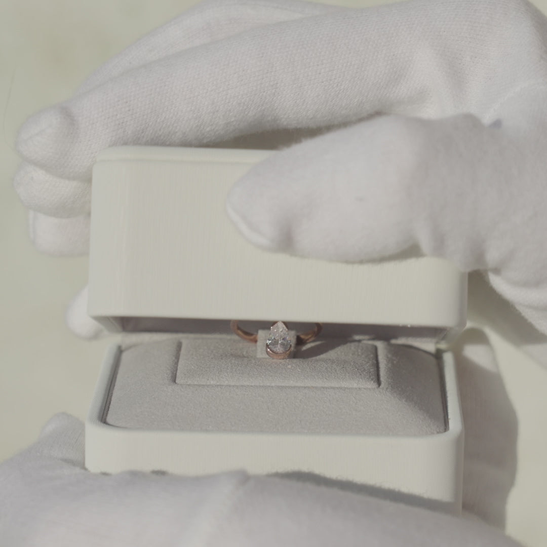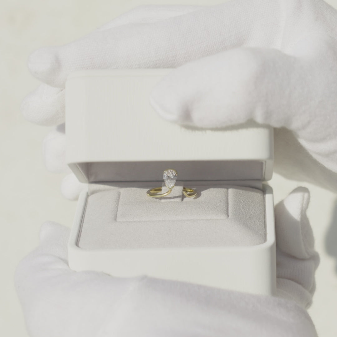 A revolutionary design where a stunning 0.5 carat pear-shaped diamond appears to float within an asymmetric band. The curved 18K gold setting creates a dynamic, sculptural form that wraps gracefully around your finger, making this ring a true piece of wearable art.